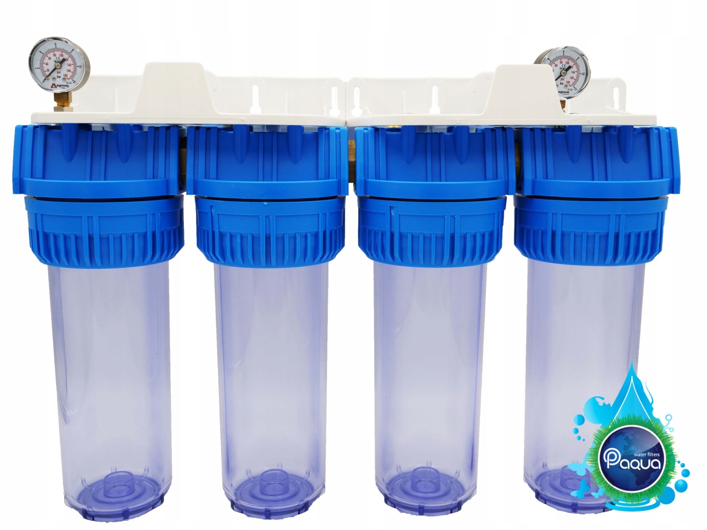 - 4 korpusy trzyczęściowe 10″ Standart na płytce (stelażu). Łatwe do rozkręcenia i odporne na skoki ciśnienia