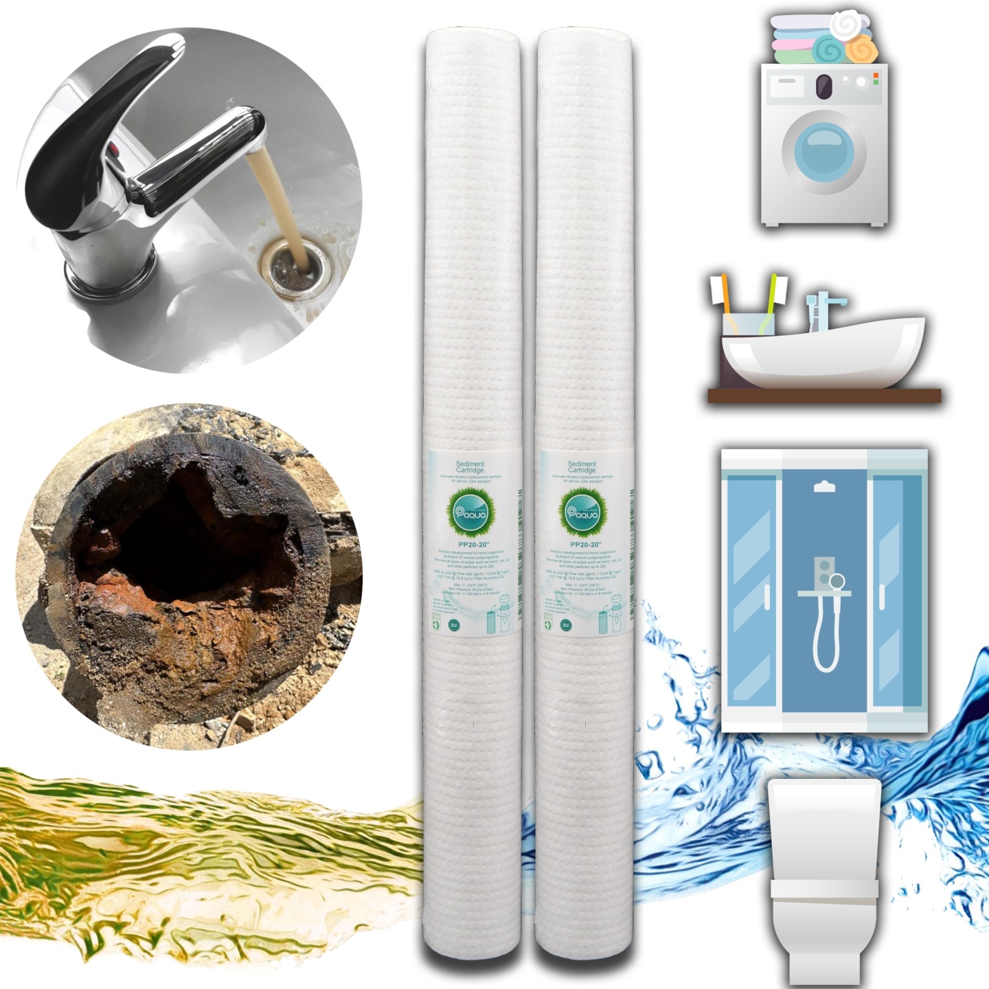 Filtr mechaniczny Paqua 20” (20 mikronów) skutecznie chroni domowy system zaopatrujący w wodę, urządzenia gospodarstwa domowego i następne etapy filtracji przed zanieczyszczeniami i osadami.
