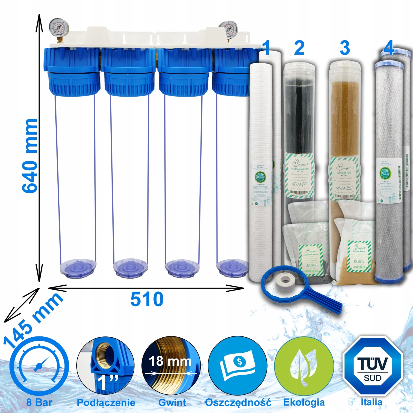 - 1 x wkład z żywicą jonowymienną Bregus 20” Slim